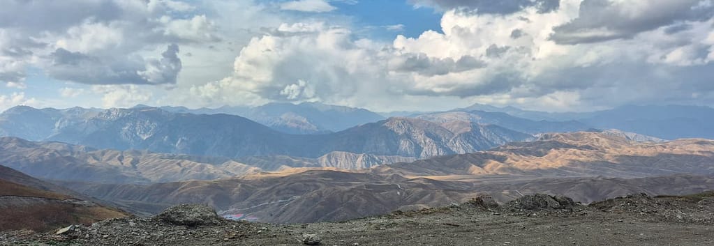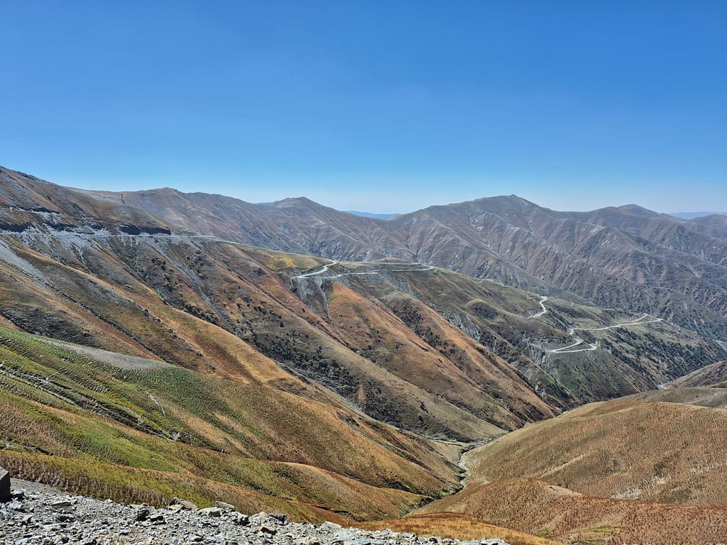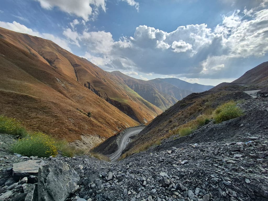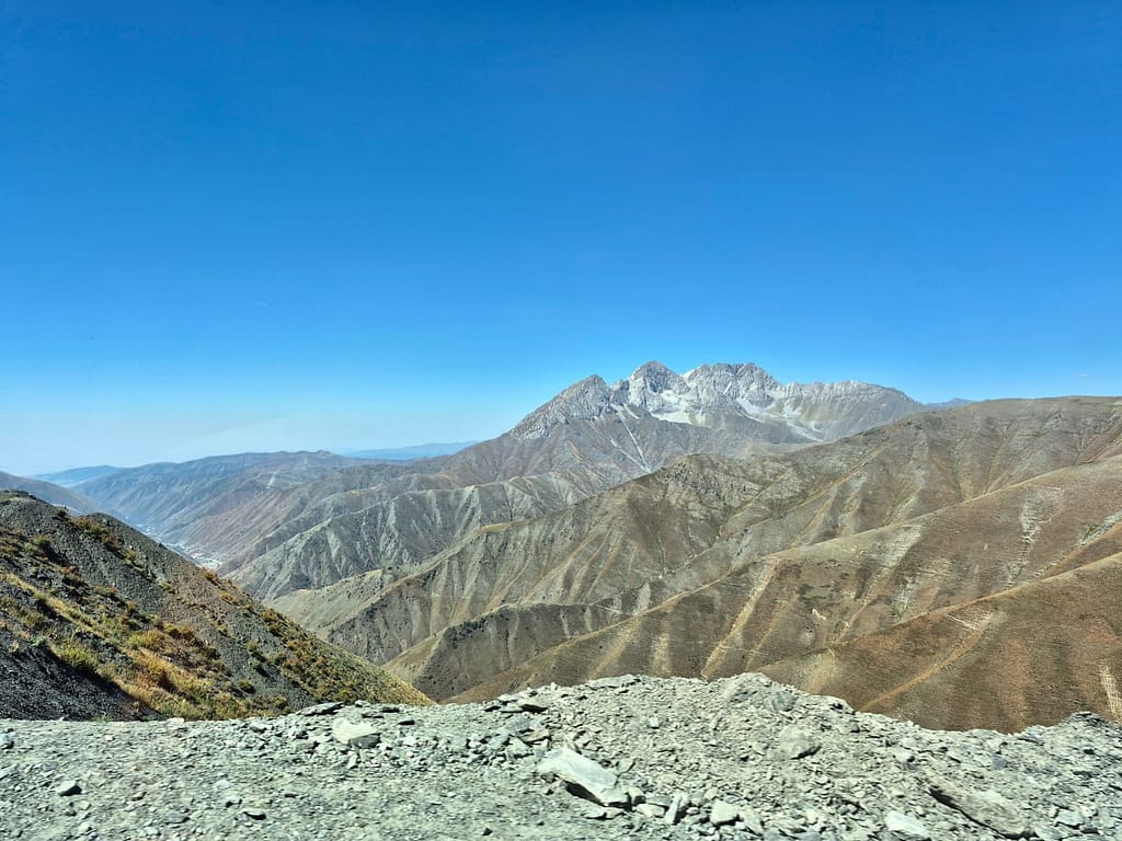 So I joined. The ride took five hours through the Fergana Range, and it was as wild as it was beautiful. The road was narrow, bumpy, sometimes nothing more than a strip of gravel clinging to the side of a mountain. But the views of jagged cliffs glowing orange, pale gray ridges, and streaks of yellow stone made every sharp turn feel like a reward. We stopped at a cold spring to splash our faces and refill bottles before pressing on.