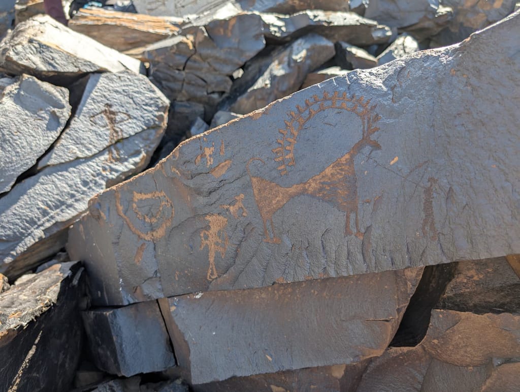 Up close, the rocks weren’t just rocks. They were alive with carvings. Deer leapt across their surfaces. Hunters raised their bows. Sun motifs burned in circles across the stone. Each one different, each one telling a story older than the mountains themselves.