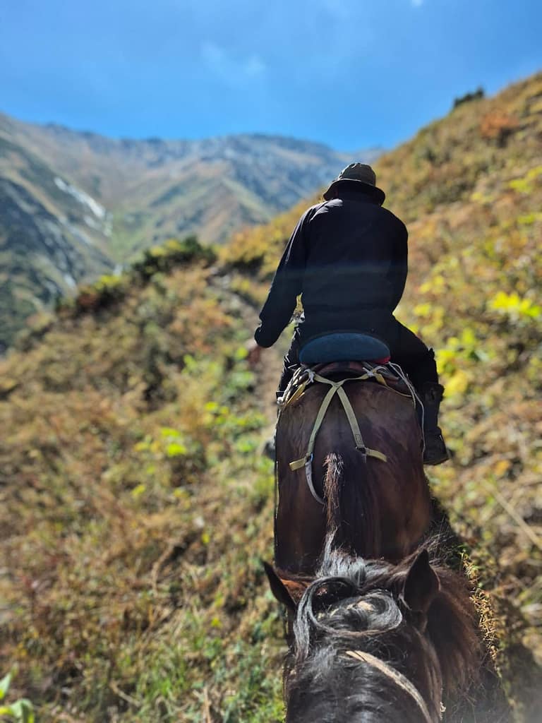 At first, the trail was deceptively easy: flat valleys, grass brushing against the horses’ legs, the sound of hooves steady against the dirt. Then came the climb. The ground narrowed, parts of the path crumbling underfoot. I held the saddle tight as my horse picked its way across ledges, shifting from steady flats to sudden, steep slopes.